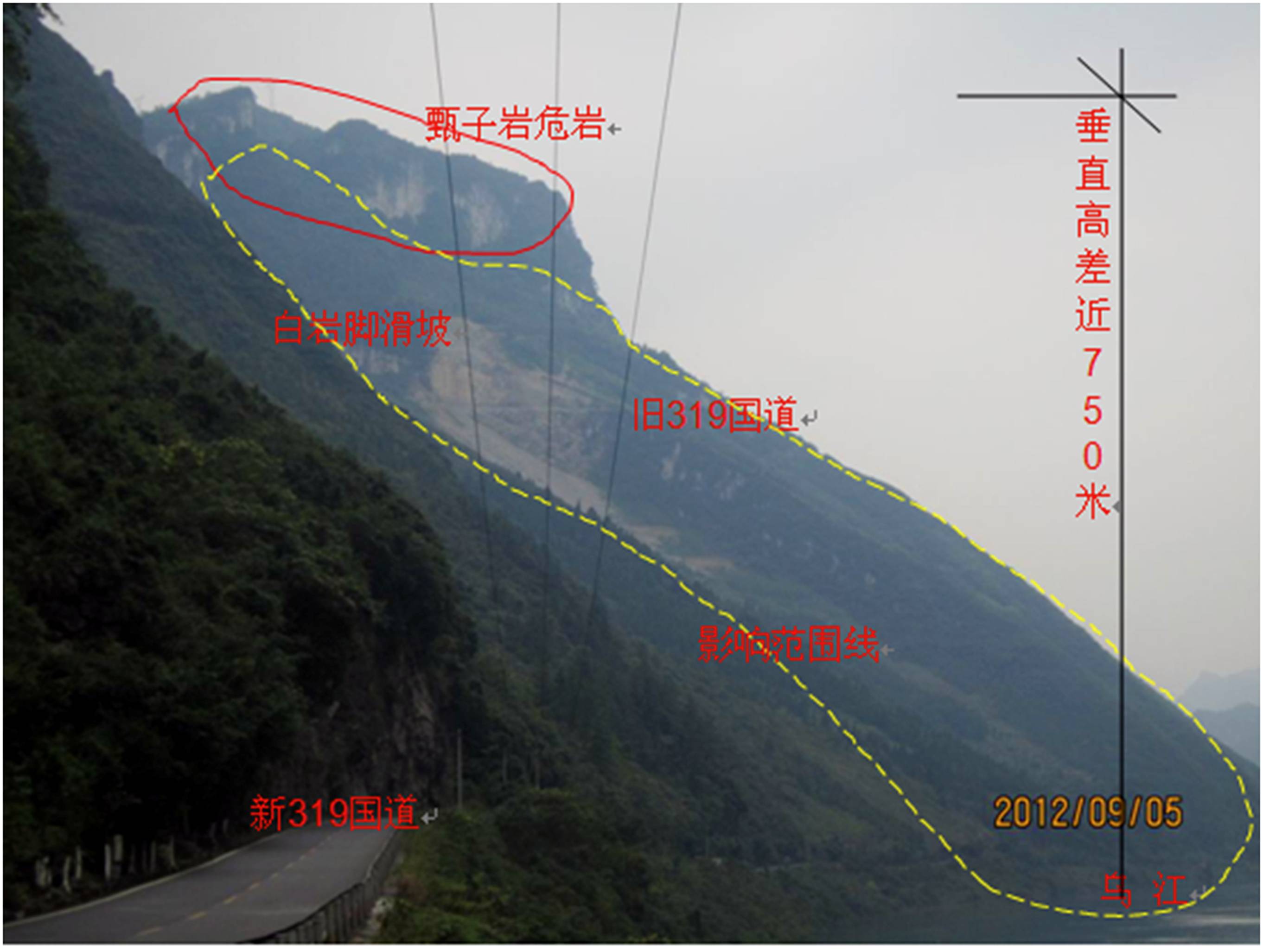 甄子岩危岩体位于武隆县江口镇旧319国道南侧斜坡坡顶陡崖带处,在高程810m~1008.58m之间分布有两级陡崖;本项目治理10处危岩单体,最大危岩单体体积22494.2m³,最小的9.3m³,其余在320-11820m³之间,危岩单体总体积约48761m³。设计方案针对不同危岩单体,采用爆破清除,原位锚固、支顶,裂缝注浆等治理方式。