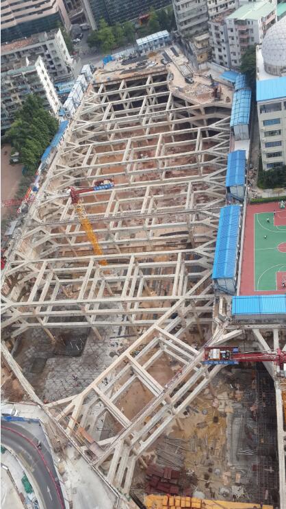 深圳市第四(福田)人民医院改造项目,基坑面积15610 m2,基坑长220m,宽118m,周长642m,整体呈“l”型。基坑支护采用止水帷幕+内支撑的结构形式,共包含3层内支撑。每层支撑由7道对撑和4道角撑组成。止水帷幕由咬合桩及人工挖孔桩和旋喷桩构成。