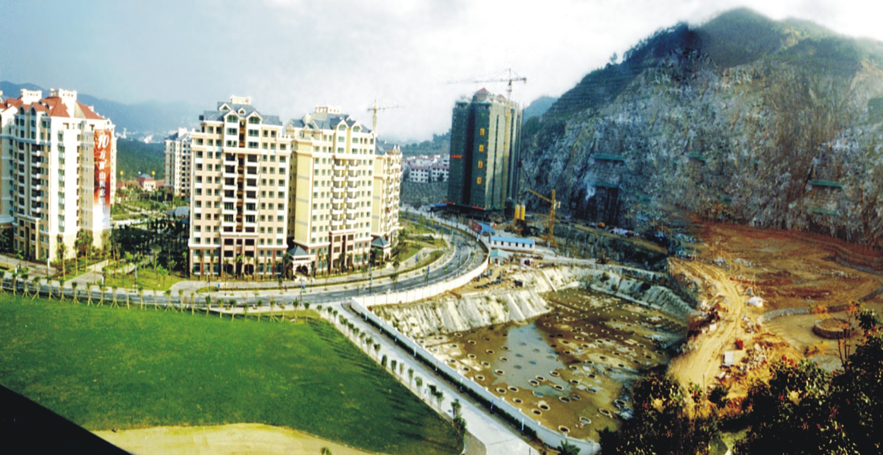 环境资源综合开发项目,地基强夯、周边斜坡治理设计与施工;场地原为采石场,面积30万㎡,采石坑深达39m,周边边坡高12-80m;回填土分层强夯法密实(共4层);斜坡采用喷护、喷锚、锚固防护、锚拉格构梁、以及绿化等方法综合治理。