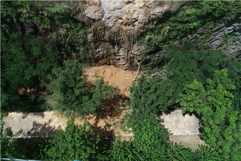 【崩塌】预警发生后,仙桐体育公园足球场北侧边坡分别于16时03分、16时06分发生两次局部小型崩塌。通过现场调查,仙桐体育公园足球场北侧崩塌体顺坡长约10~15m,宽2~3m,厚度1~2m,方量约30m³。崩塌体主要由砂质黏性土及强风化凝灰岩组成,堆积于坡面、坡脚,崩塌段周围树木倒伏明显且根系外露。