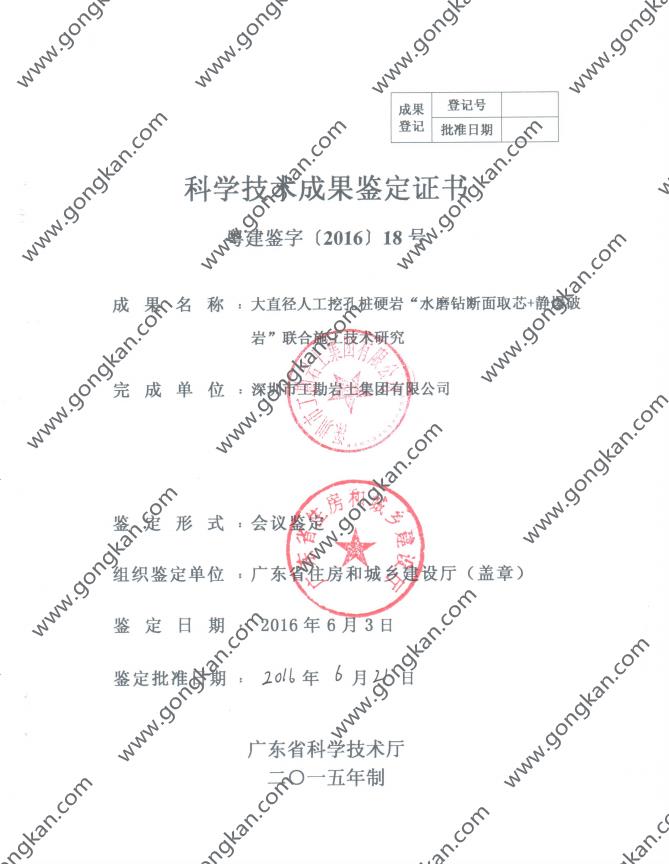 • 2016-018 大直径人工挖孔桩硬岩“水磨钻断面取芯+静爆破岩”联合施工技术研究